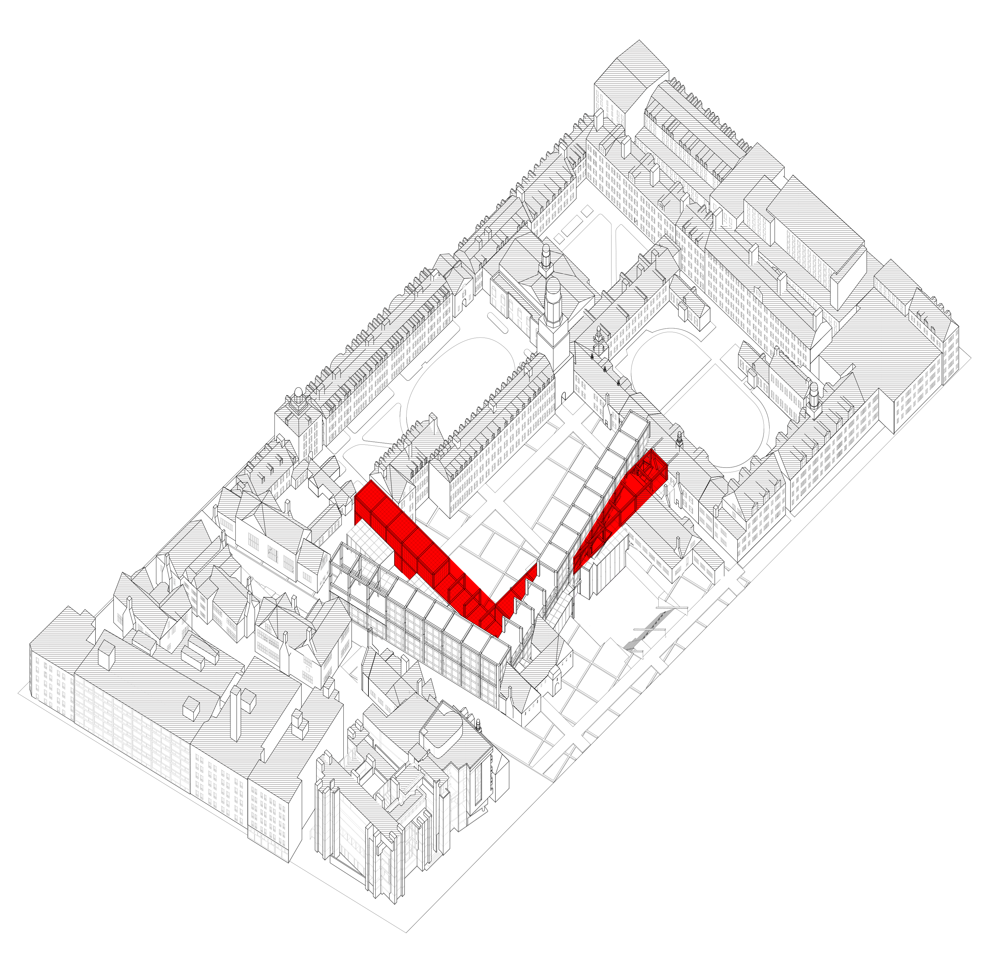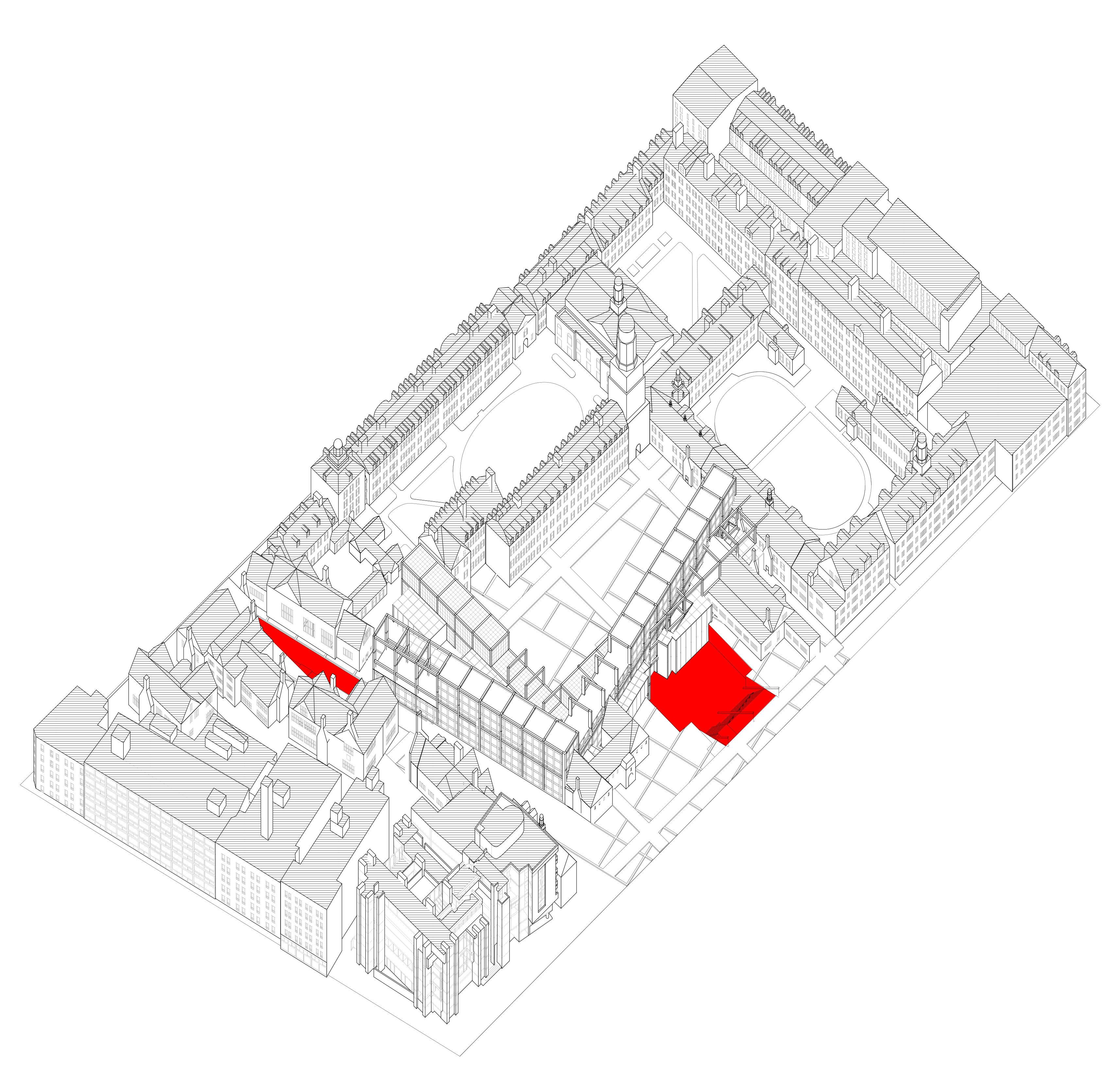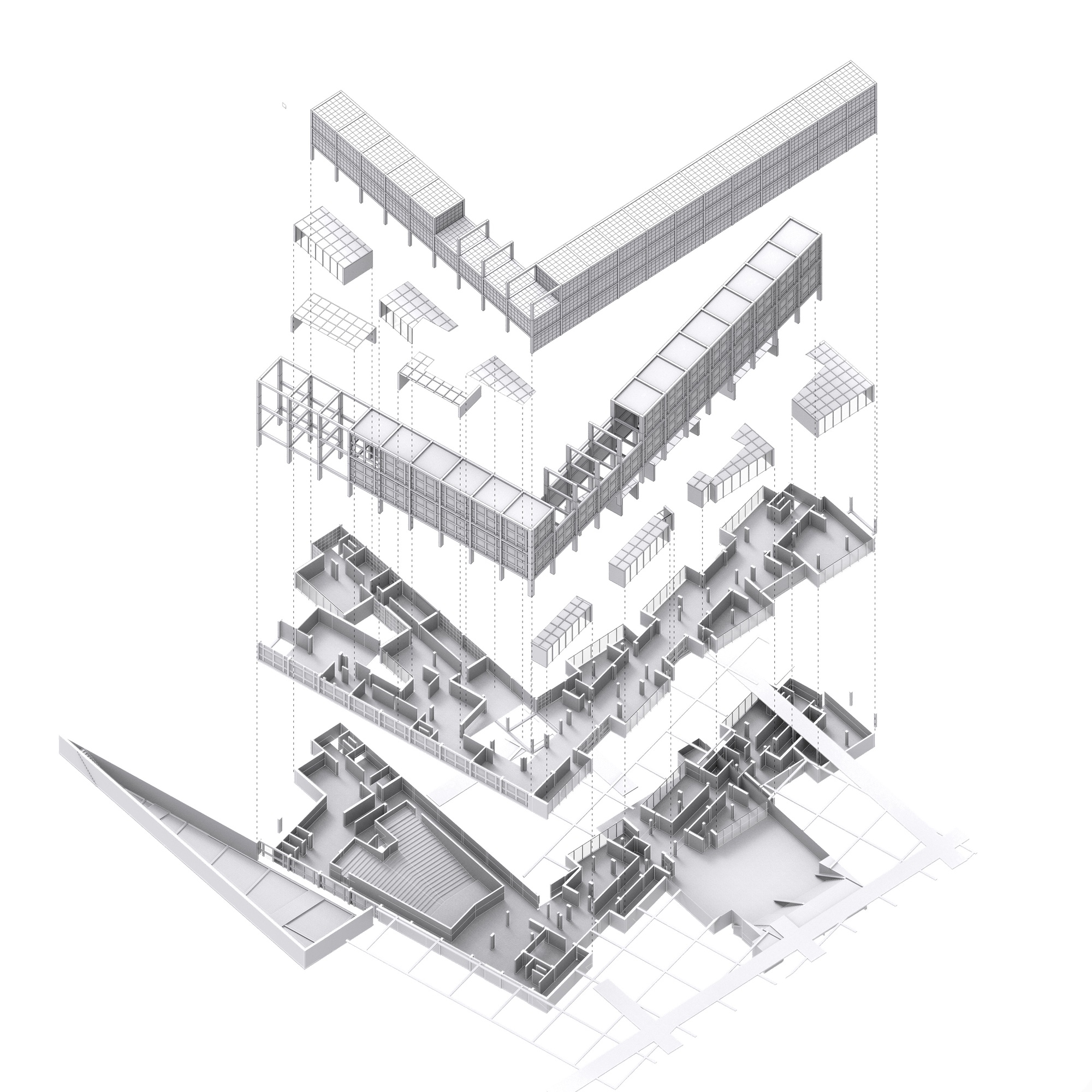 Finally, the project proposes a new ground condition on the block, which is extremely figural. The continuous ground merges various levels of the building.