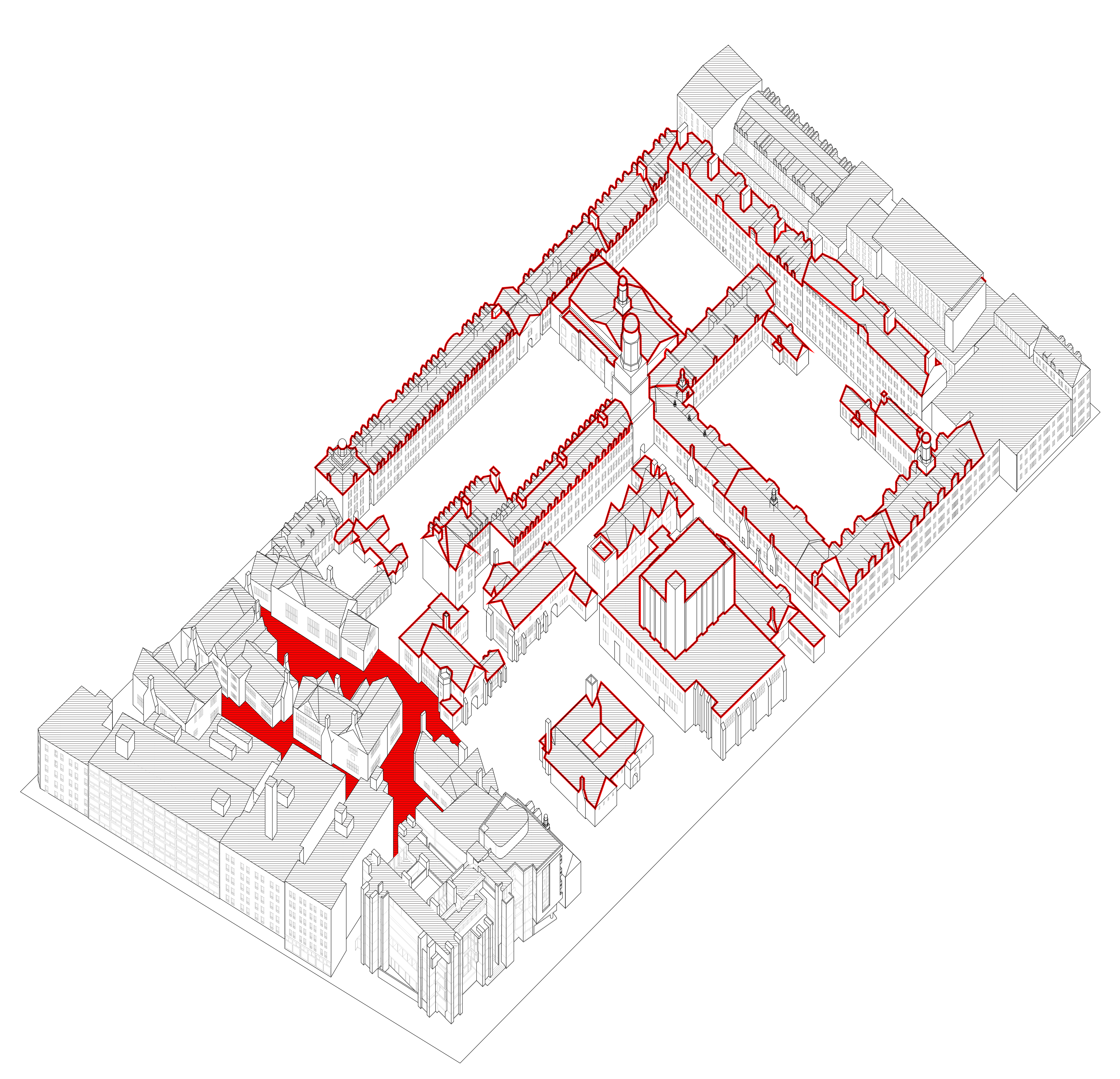 Adjacent to Davenport’s broken frame, in the middle portion of the site object buildings such as Drama School and Wolf’s Head are the prominent elements.