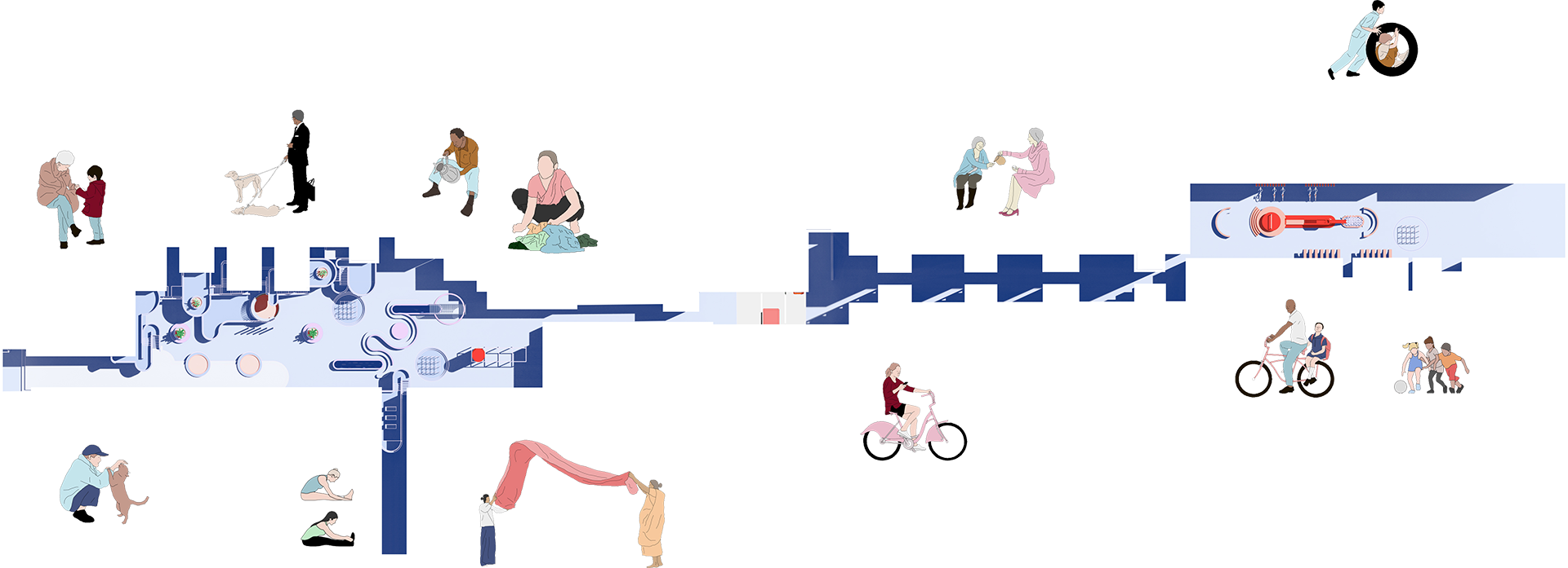 This project aims to transform routine individual activities—like doing laundry, praying, or walking dogs—into communal experiences by integrating them into a new urban network. Starting from an underutilized lot, the design creates a blend of public and private spaces that fosters neighborhood collaboration and redefines usage of both personal and communal areas. By introducing specialized sub-programs and creating transitional zones between public and private, the project seeks to revitalize and expand the communal fabric of Santa Maria la Ribera, enhancing connectivity and functionality while preserving the essence of private spaces.
