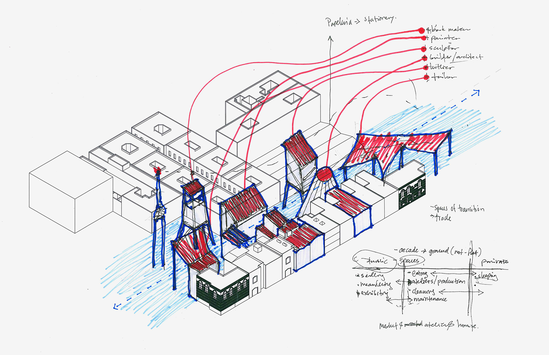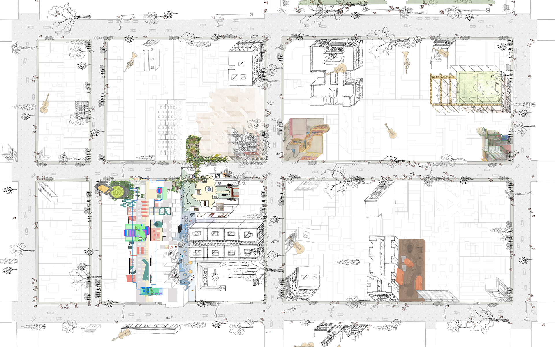 Group drawing of neighborhood. Each student made interventions on the neighborhood in a precise way that communicates with the rest of the projects and the larger context. Drawn in collaboration with Taiming Chen, Helen Farley, Gretchen Gao, Michael Glassman, Mari Kroin, Hojae Lee, Jackson Lindsay, Christine Pan, Deirdre Plaus and Gus Steyer.