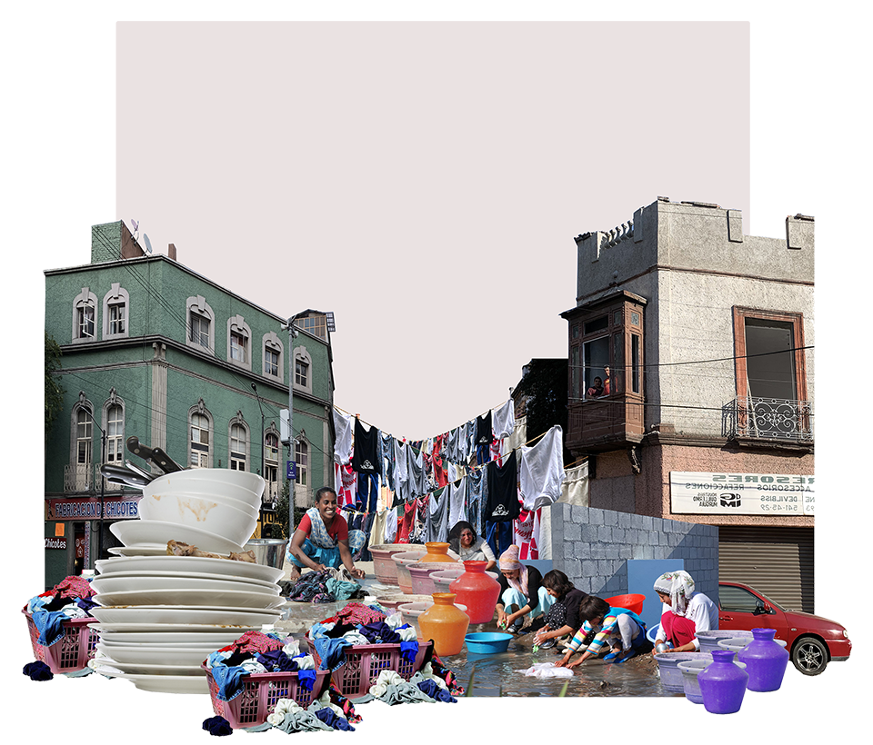 The design creates spaces to do laundry as a commune. The architecture of this space forms extensions that allow this activity to happen outdoors while offering spaces where people can hang washed clothes, sit, wait, and interact.