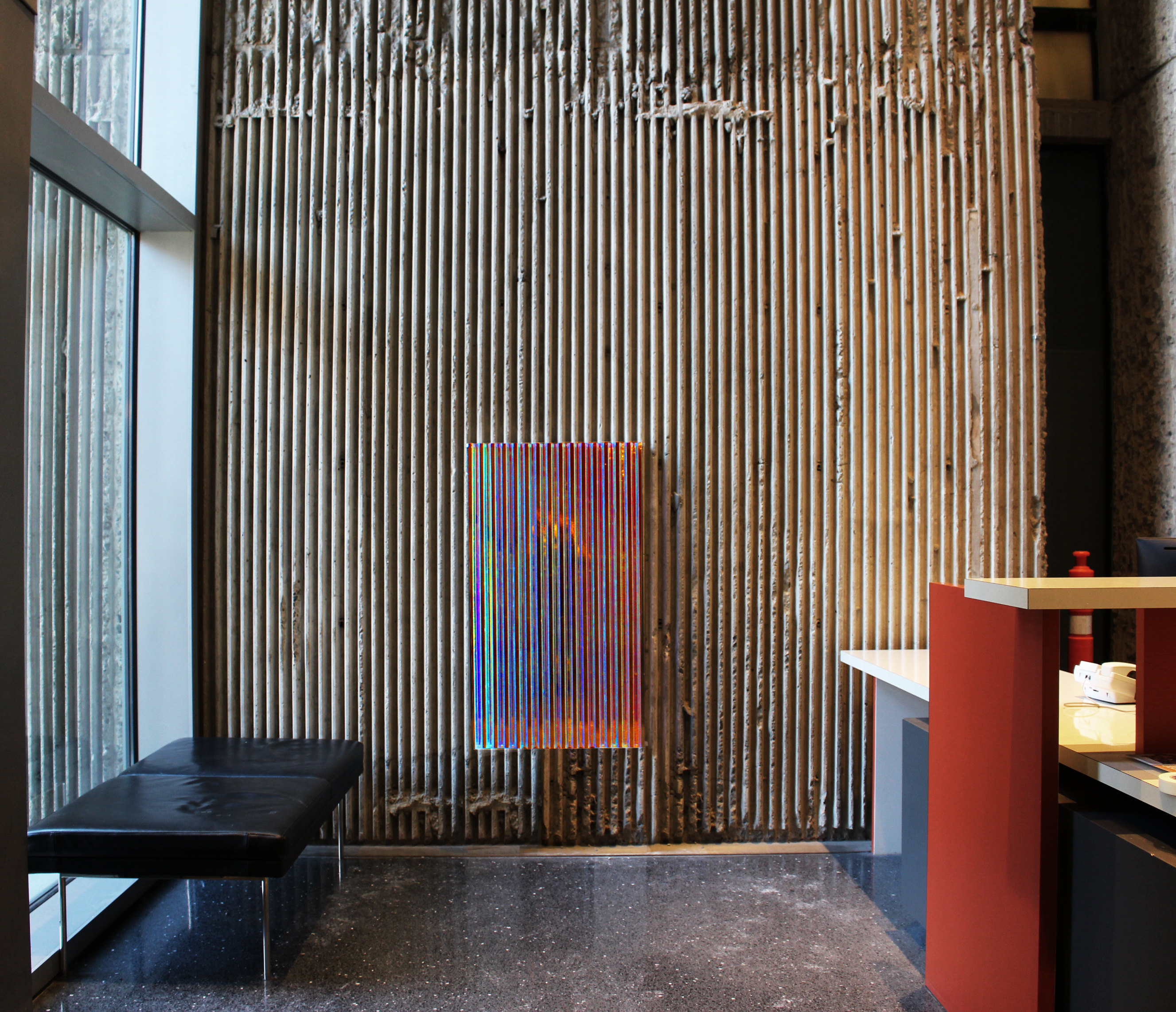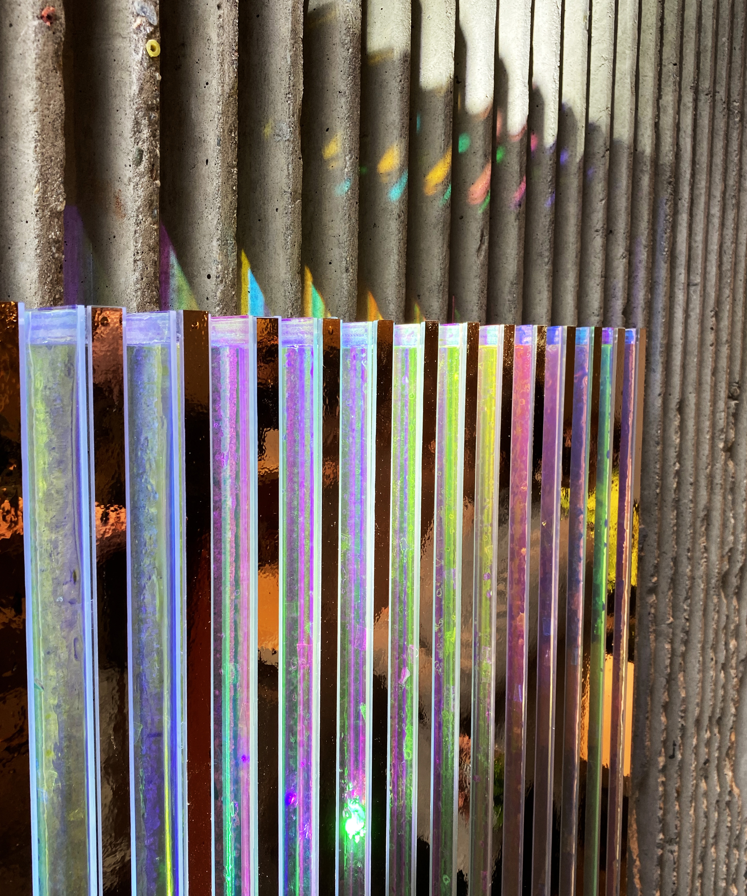 Portal is a material study on plastics and the potential of reflection, color and transparency. Sited at the Loria Entrance lobby, the installation mimics the texture of Rudolph Hall’s characteristic wall, which remained unchiseled due to the removal of an adjoining building during the renovation. The intervention creates a new interaction of light in the space as well as increased human interaction with the iconic wallspace of the building through reflection.